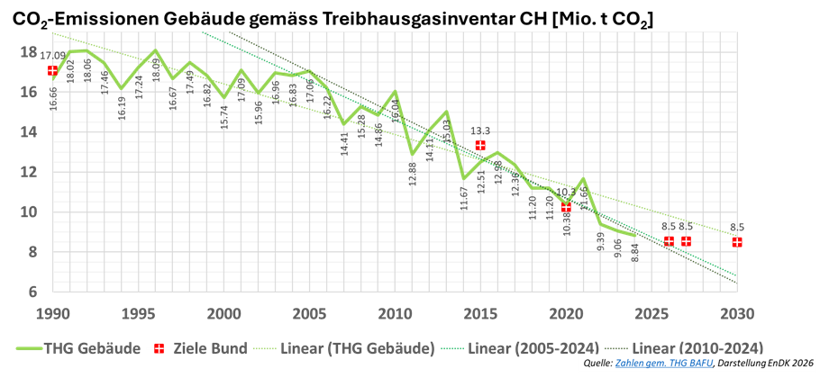 Die Schweiz hat ihren Treibhausgas-Ausstoss im Jahr 2024 um 27,3 Prozent gegenüber 1990 – von 55.2 auf 40.1 um 15.1 Mio. Tonnen CO2 – vermindert. Mit einer Reduktion von 7.9 Mio. Tonnen CO2 hat der Gebäudebereich wesentlich dazu beigetragen, obwohl die beheizte Energiebezugsfläche wie auch die Wohnbevölkerung zugenommen haben. Der Gebäudesektor für sich betrachtet hat den CO2-Ausstoss gegenüber 1990 um 47 Prozent gesenkt und verursacht noch 22 Prozent der inländischen Treibhausgasemissionen. Dies konnte durch eine vermehrte und umfangreichere energetische Sanierungstätigkeit ineffizienter Gebäude sowie durch den gesteigerten Ersatz von fossilen durch erneuerbare Energieträger für die Gebäudeheizungen erreicht werden. Diese Entwicklung unterstützt haben die Lenkungsabgabe auf Brennstoffe, das Gebäudeprogramm von Bund und Kantonen sowie die kantonalen Energiegesetze.